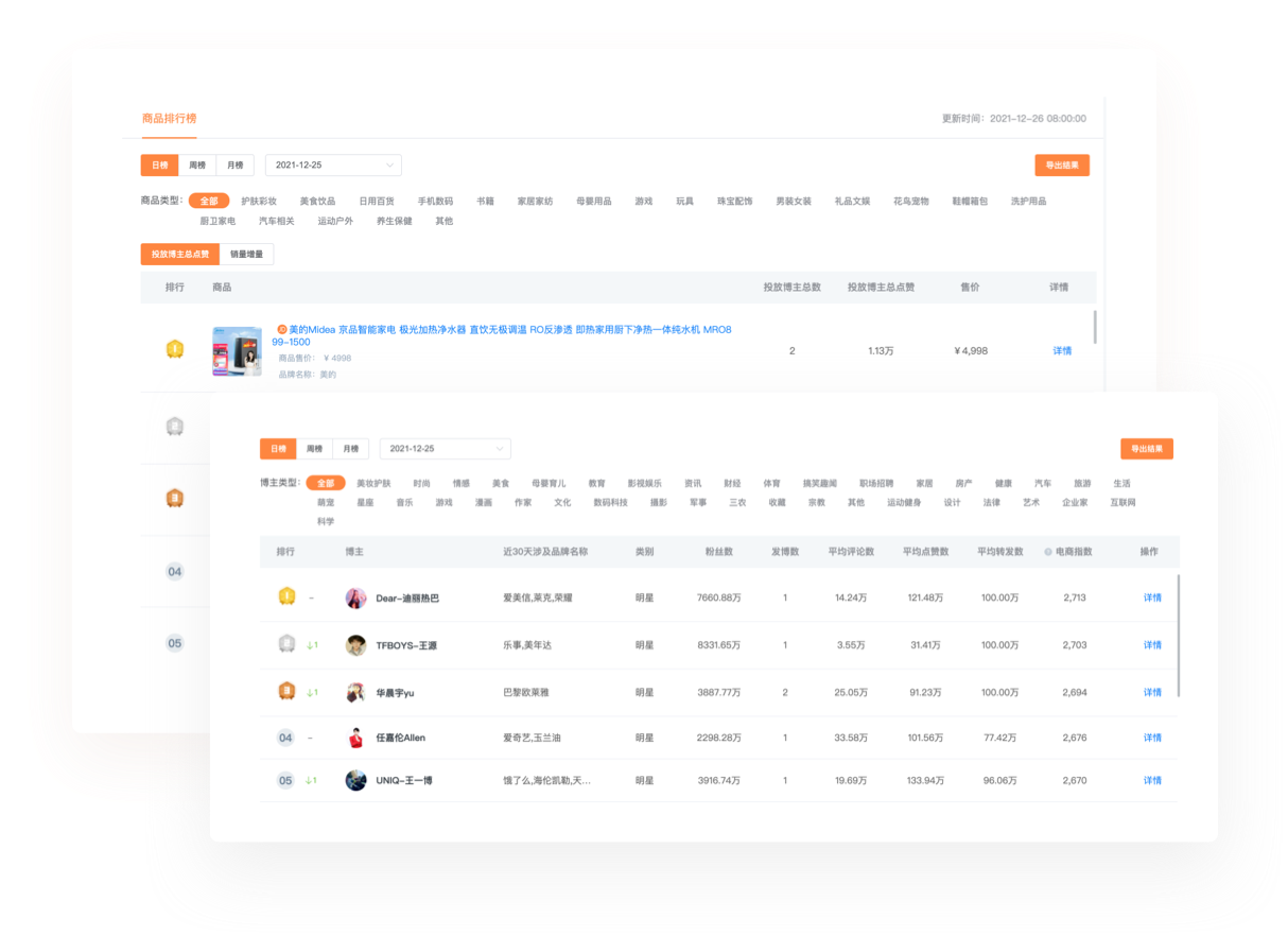 多項內(nèi)容全面解讀達(dá)人,歷史內(nèi)容追蹤,AI去水粉絲預(yù)估,智能算法評估達(dá)人價值,有效挖掘優(yōu)質(zhì)達(dá)人